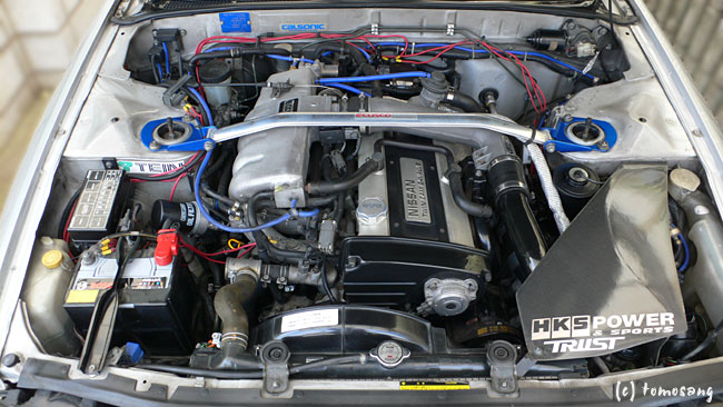 うちの32は簡単な作業くらいでは手が汚れない程度に普段からエンジンルームも綺麗にしているのですが、入り組んだ部分はどうしても手が入らずに汚れがたまります。納車予定日だった日【「愛車を受け取りに」参照】、まだ作業中でそういった場所周辺のパーツが外されていたので「ちょっと時間を貰ってここの汚れ落としたいな」とか思ったものの、作業の邪魔になると思い我慢してました。(写真を撮ってる時点でかなり邪魔だったはず(笑)