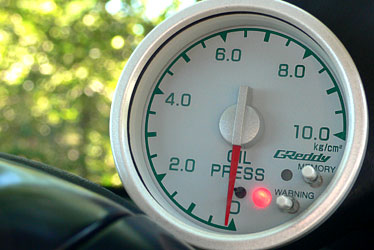無料なんで、フラッシング代わりに交換してもらった純正オイル。特別ハードな走行をしたわけでもないのに、外気温31度(AC温度計による)、油温約90度でアイドリング時の油圧がほぼ0k。