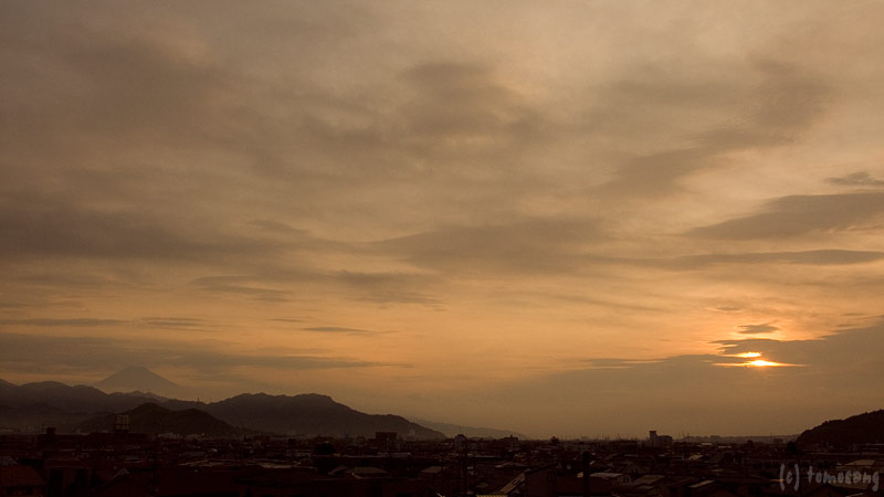 カメラを取りに部屋へ戻り、マンション屋上へよじ登って撮影。朝陽は大した事無かったがこれで気分高揚。