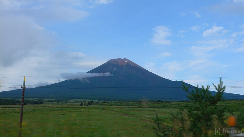 富士、御殿場、須走と空はスッキリせず、小雨ぱらついたりしていたので「今日は無理かも」と言いながら高速を走り続ける。その後、トンネルを抜けて富士吉田市に出た途端、別世界へ出たかの様に晴れ上がった。ふと横を見ると「富士山丸見え!」