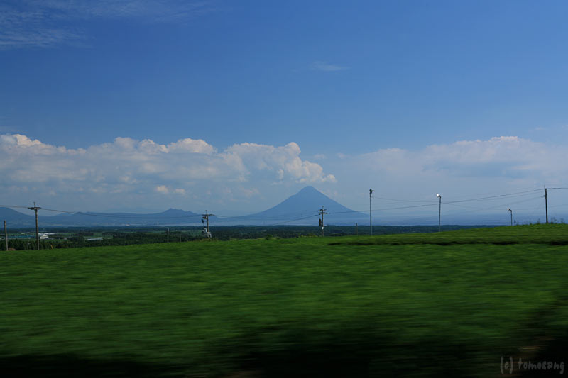 走行中の助手席から撮影したので綺麗に撮れていませんが、茶畑の奥に海を挟み開聞岳。素晴らしい眺めで、オススメのドライブルートです。