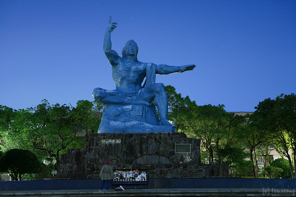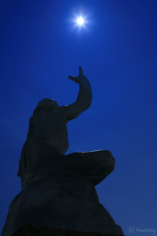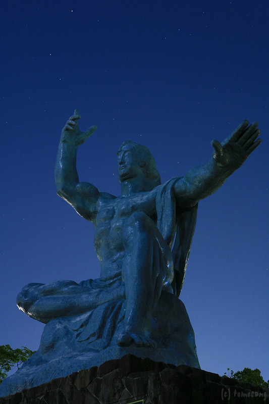 長崎に来たのであれば寄っておかねばなるまい。「平和祈念像」がライトアップされていると思ったのだけど、真っ暗だった。公園内の街灯が一個おきに消されていたから節電なんだろう。幸い月が出ていたのでバルブで月光浴撮影。