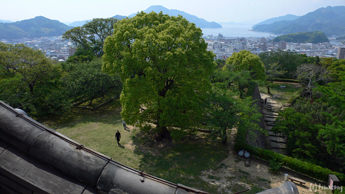 急な石段を上って天守閣へ。階段のきつさと蒸し暑さに、広場に出た所で天守閣を前にしばらく休憩。
