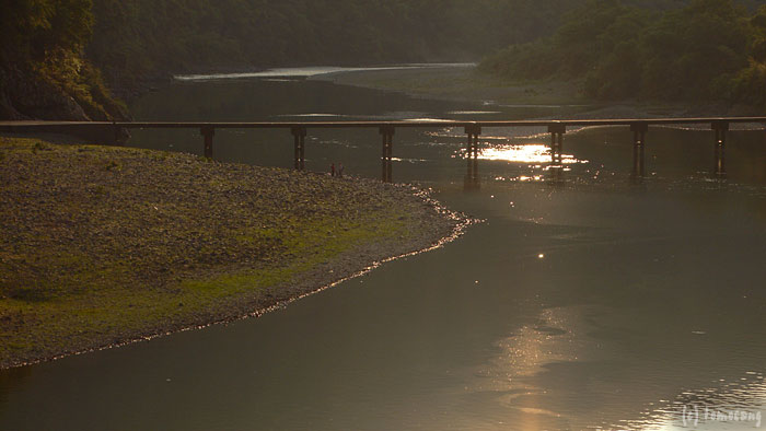 観光ガイドで沈下橋が紹介される場合、写真はたいていこの橋のようですね。太陽がちょうど山の稜線上にあって逆光でうまく撮れてません。