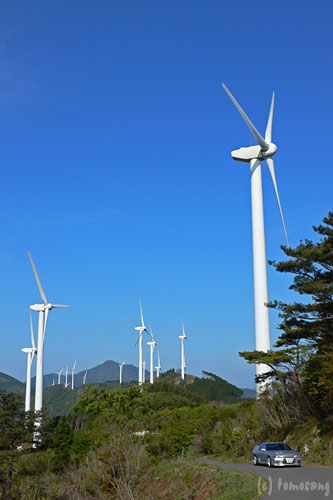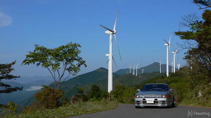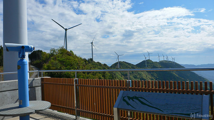 暫くすると今度は右手の山の稜線に大量の風車群が見えてきた。そこでやっと羽の展示してあった意味がわかった。そのまま暫く走り続けていると誘導標識が出ていたので、その方向に曲がってみた。距離にして約10kmと出てたものの、山道(舗装はしてある)なので随分と長い道のりに感じ、いつになったら到着するものかと。デフ入ってて良かった(謎)