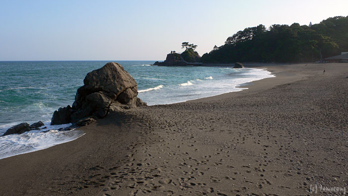 この銅像の前、龍馬の視線の先に砂浜がある。階段を下りて浜へ向かいます。