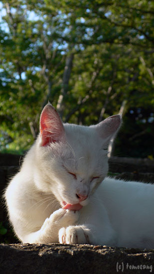 昔から住み付いているグループには入ることが出来ず、いつも一匹でうろついている。この公園には住み付いている猫へ餌をあげに来ている人がいるようだが、こいつはグループに入れないのでいつも餌にありつけないでいる。かわいそうなのでたまに餌をあげに行っていたら、完全になついてしまった。