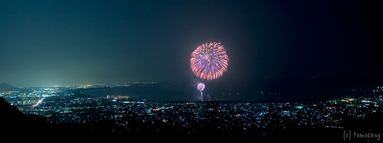 撮影待機中に話をすると、宮地側から登ってきていて、帰りも宮地側への山道を歩いて帰るつもりのようでした。装備といえばカメラをぶら下げ、三脚を肩にからっているだけ。だから花火終了後の機材片付けも早く、三脚からカメラを外して足を縮めるだけで「お先に」と山道に入って行った。照明器具も持たずに・・・