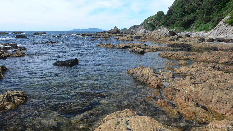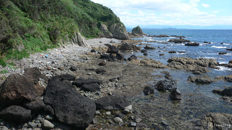 残念ながら、この日は潮の引きが足らずに辿り着けませんでした。家に帰って調べたら、大潮の日でないと一周は不可能らしいです。とはいっても、岩壁側の水深は数十センチ。アクアシューズ(ウォーターシューズ)履いていたのでそのまま突っ込んで行っても良かったけど、32で来ていたから海水はね・・・