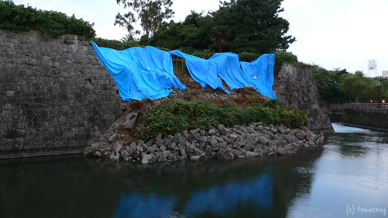 今現在の唯一の見所といえば、先日の地震で崩壊した石垣ですかね。
