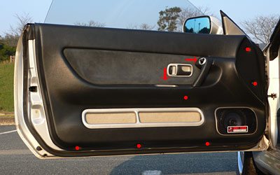 運転席側は赤点箇所と、矢印のドアを閉める時に手を入れる場所の底にある蓋を外すと、奥にネジがあります。ネジを外したら、パワーウィンドーのスイッチとドアノブカバー(この写真ではシルバーになってる部分)を隙間からマイナスドライバーを入れて外す。後はトリム本体のクリップをドアに差し込んで固定しているだけなので、全体を手前に引けば外れます。
