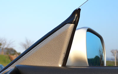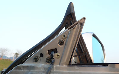 下の写真で言う、垂直部のコの字形部分と、斜めのL字形部分を挟み込むようにウェザーストリップを取り付け。なおかつ垂直下側の奥に差し込む固定クリップのようなものまであったり。それを最後にドアミラーで挟んで固定するようになっている。