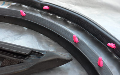 それでは新しいウェザーストリップの装着です。取り付けはドアミラー側から行った方が良さそうです。