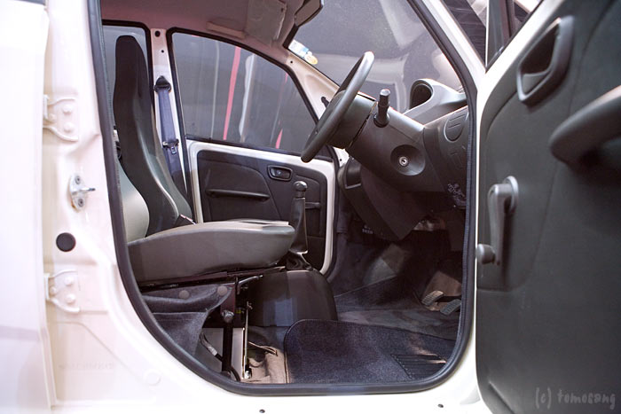 生産国での人件費とこの装備。安い理由は見れば納得。営業車のような内装で、装備というものはエアコン・ステレオなど何も無し。バッテリーはシート下に剥き出しで置いてありました。