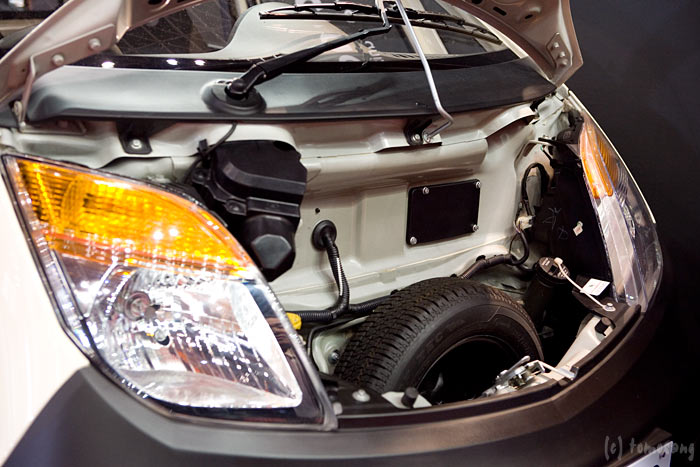 ボンネットを開けるとスペアタイヤが入っている。給油口もこの中らしい。