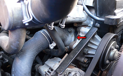 ロアホースを抜くとクーラントがジョパッと出てきます。落ち着いたらサーモハウジングを外します。12mmのボルトが3本。手前2本は簡単に外せますが、奥側が・・・・無理!