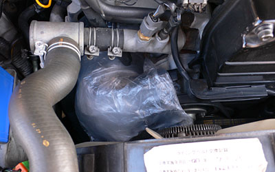 まずはオルタネーターにLLCがかからないよう、ビニールをかけて保護します。