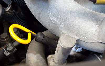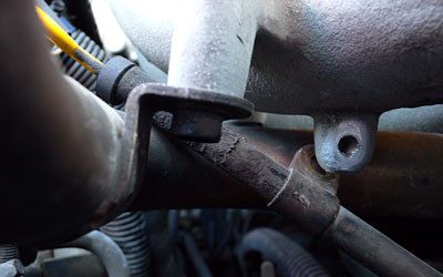 上手く手を入れて確認してみたら、角を軽くなめているようだ。コマを嵌めた状態で確認してみたら、オイルレベルゲージの管が邪魔で斜めに入っている。エクステンション無しだとラチェット回らない。有りだと斜めで緩められない。何か方法があるはずだと観察していたら、オイルレベルゲージの管を固定しているボルト発見!