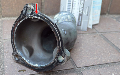 外したハウジングには古いシーラーのカスが残っているので、綺麗に落とします。矢印の溝部分も忘れずに。