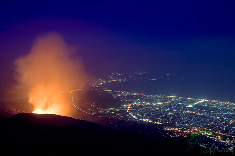 位置的に鉄輪温泉の湯けむりライトアップかな?と最初は思ったが、すぐに扇山の野焼きだとわかった。つまり、今日は別府の温泉まつりの日ということだ。日帰りを予定していたが、急遽別府に一泊することに決め、いつも宿泊している駅前の宿(一般的には婆様邸という)に宿泊予約を入れた。