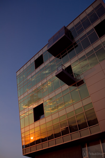 ところがサイバー大学の壁面ガラスに写る夕陽が目に入り撮影開始。