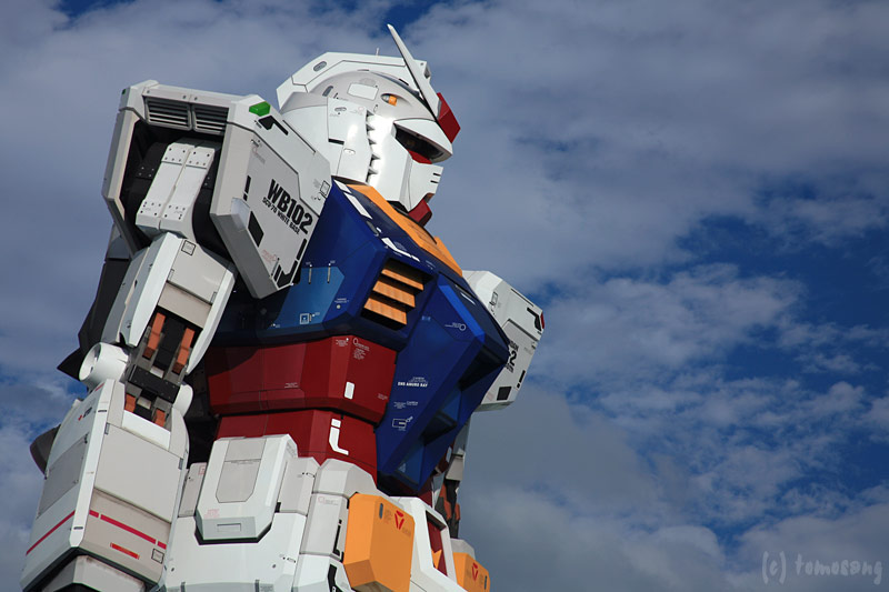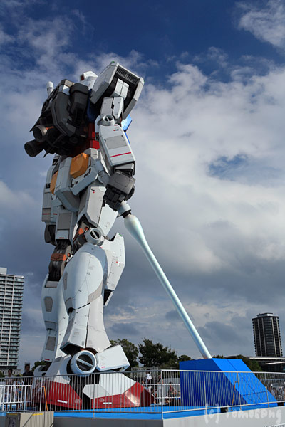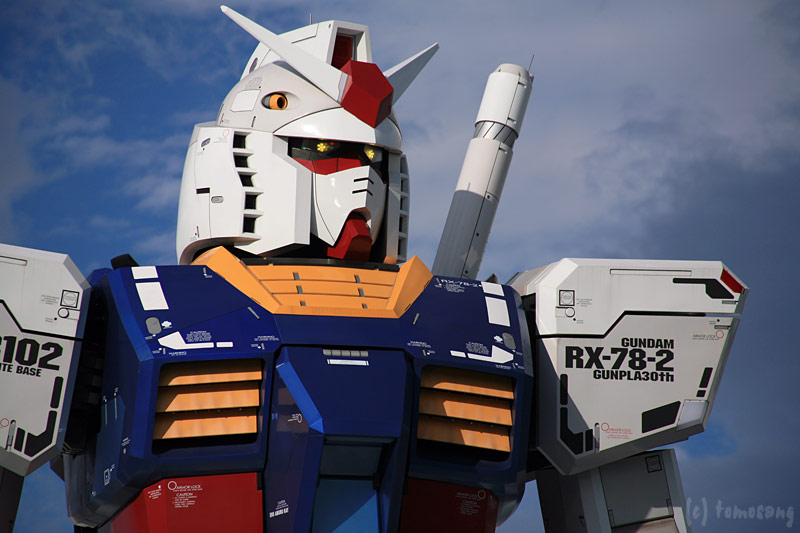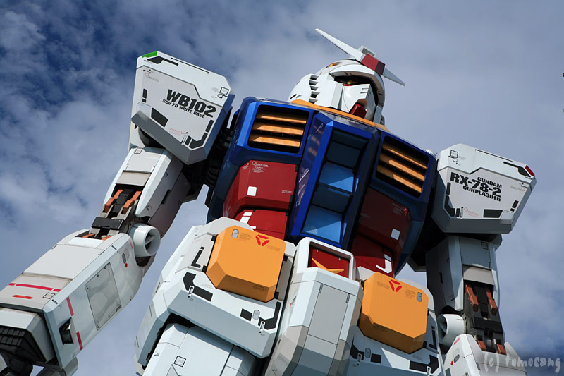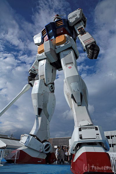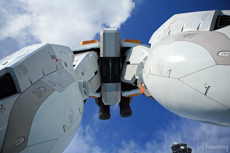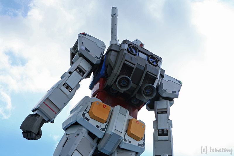 足元まで行って実際にガンダムを触る事が出来ると言う事で、行列に並ぶ。とは言っても一グループ分待っただけで自分達の番に。さて台に上ろうかと思ったら、定時パフォーマンスというものが行われるらしく、足元で暫く待たされる。何があるのかとカメラを動画モードで撮影していたのだが・・・首が左右に動いただけでした。