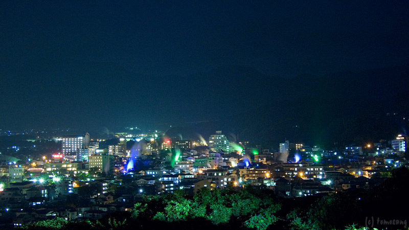 土曜、日曜、祝日とイベント時には湯けむりをライトアップということだが、到着時は点いていなかった。どういう事だと思いながら夜景撮影。