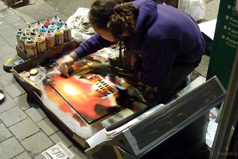 コルソ通りからこのお土産街へ曲がり、歩いていると人の群がる一角。覗いてみるとスプレーペイントを行っている。一帯が揮発剤臭い・・・