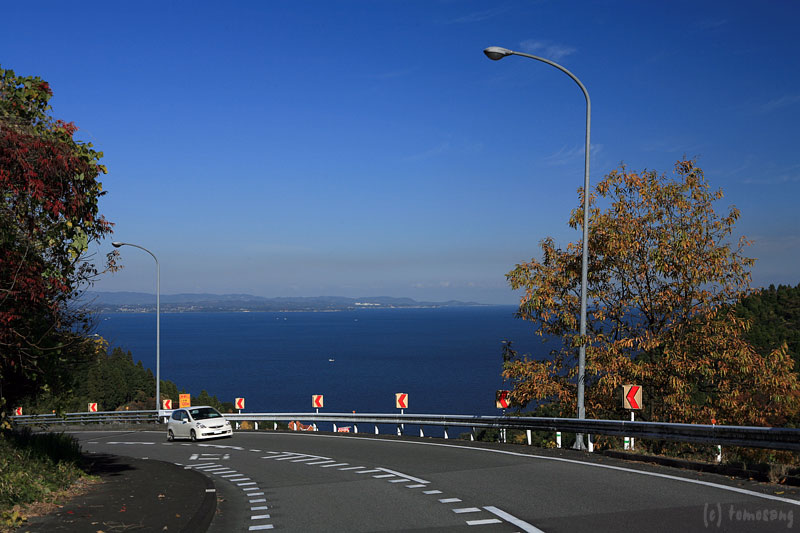 別府市側国道10号線から入って暫くの狭い道を抜けると広い二車線道路に出る。少し走ると視界が開けて車窓から海を眺める事が出来る。