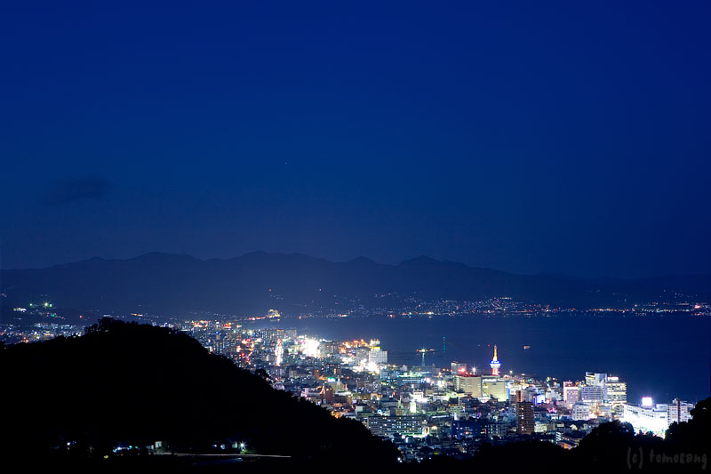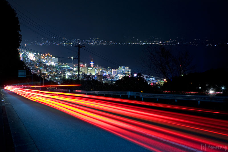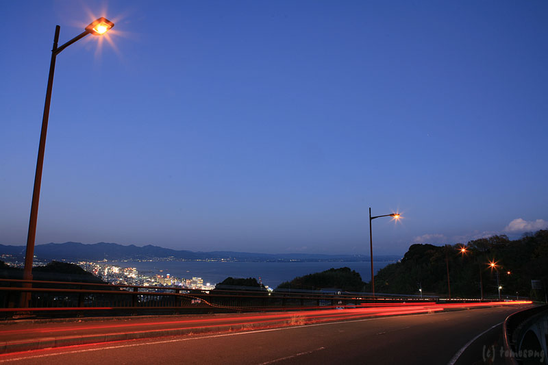 夜間走ると。別府の街明かりに向かってランディングしている飛行機のようだ。