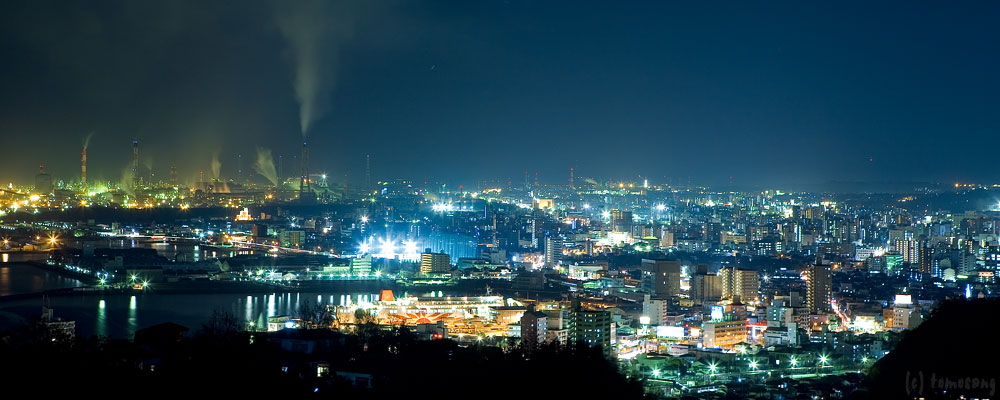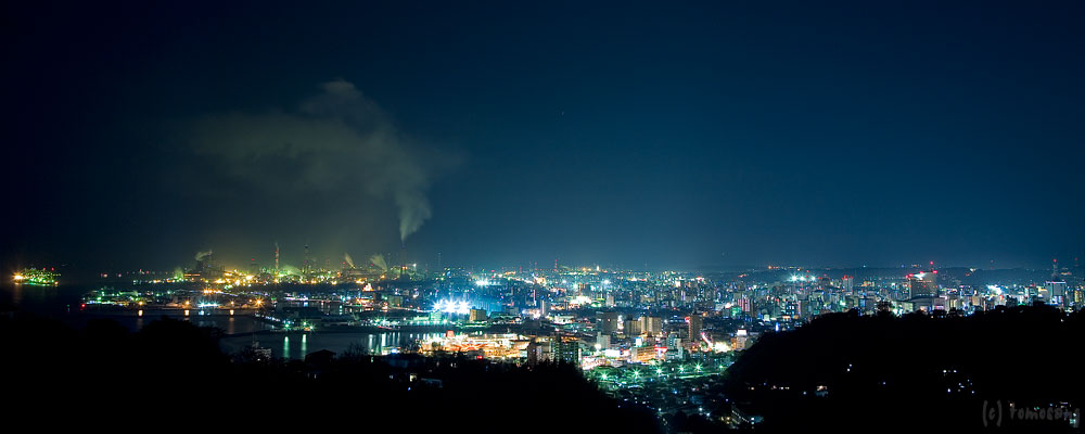 西大分の高台にある住宅街。その中にあるレストランへ食事に行き、この見晴らしに気が付きました。大分港やその奥に工場夜景を眺めることが出来る。