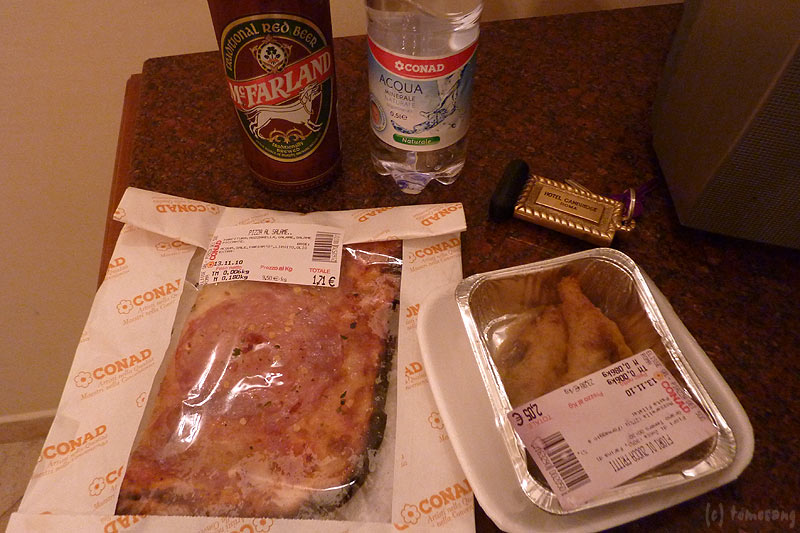 晩飯はテルミニ駅地下にあるスーパーで切りピザとチキン+ビッラ!