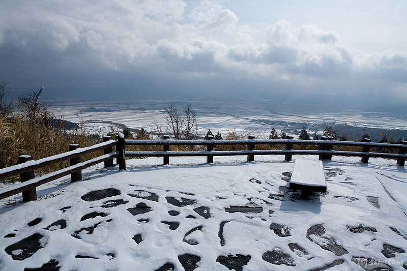 日差しが強くなり、雪も溶け始めている。途中で車を止めて阿蘇谷を見下ろしてみたら真っ白だった。