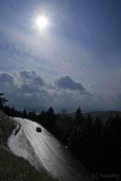 さらに上りミルクロードへ。小国・やまなみハイウェイ方面は開放されていたけど、大津方面は積雪により通行止めになっていた。大観峰への入口から先は除雪もされておず真っ白。