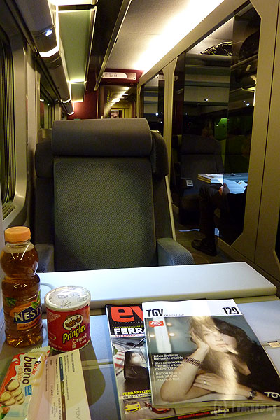 各席には車内誌が置いてありましたけど、フランス語なので当然読めません。お茶とお菓子、下に隠れている自動車雑誌は駅売店で購入した持ち込み品です。