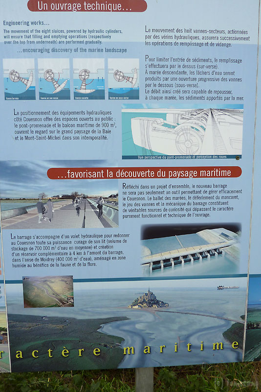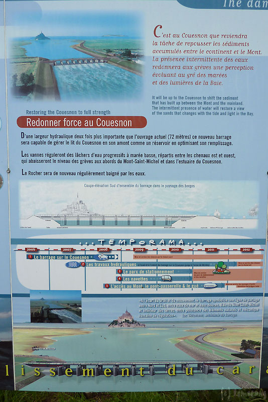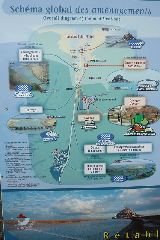 そこで、本来の姿に戻そうと始まったのがこのプロジェクト。工事そのものは2006年から始まったような記憶があります。堤防を撤去して川の流れを改修。川にダムを造り、干潮時に放水することにより、その水流で堆積した土砂を押し流す。堤防撤去後、観光客らは数キロ離れた駐車場(ホテルle Saint-Aubertの裏)から専用のシャトル(サイトには馬車の写真が掲載されている)で移動するか、新たに作られる橋を渡って修道院まで行くことになる。