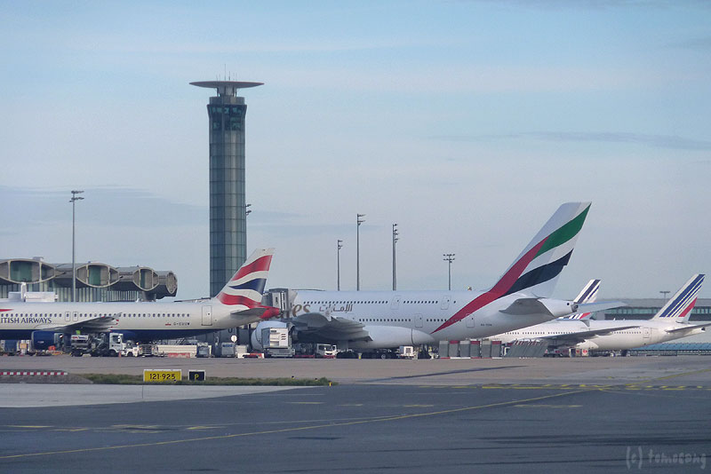 外を眺めていたら異様に大きな機体が一機。噂のエアバスA380だ。エミレーツかな?