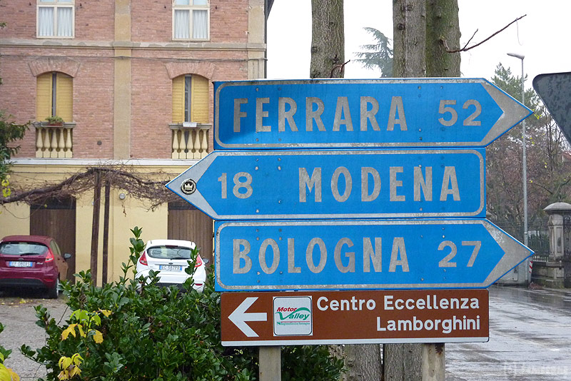 【Sant'Agata Bolognese / サンタアガタ・ボロネーゼ】という街にあります。Busto Arsizioから直線距離で約210km。アウトストラーダをひた走ること約2時間。田園風景の中を抜け、集落に入ると工場があります。グーグルアースで見ると分かりますが、畑の中にある小さな集落。ランボルギーニがあるから出来た集落といった感じがします。ランボルギーニがどういう会社だったかを考えると、畑の中にあるのにも納得できる。