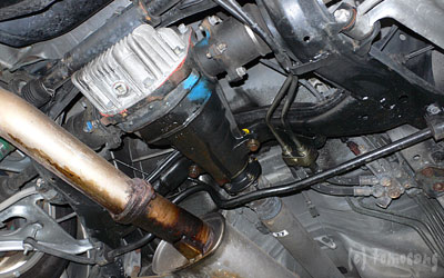 信号停止した時に下周りからビビリ音がしていた原因はこれでしょう。横から覗き込んでも原因が分からなかったけど、これで解決。メカニックの人も気が付いたようで、無くなっていたナットをどこかから持ってきて締め込んでおいてくれました。さんきゅー!