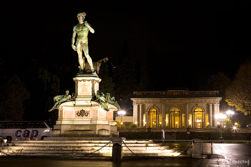 フィレンツェSMN駅の前からバスが出ています。バスの番号は12番か13番のどちらに乗っても広場に行ける。番号の違いは右回りで行くか左回りで行くかの違い。12番で行き、12番で帰れば街を一周して戻ることになり、12番で行き、13番で帰れば行き帰り同じ道を通ることになる。その逆パターンもあり。12番利用の方が距離は短く感じました。(2010年11月現在の情報です。バスに関する最新情報は駅のチケット売場で確認して下さい。)