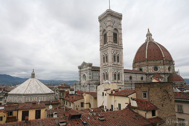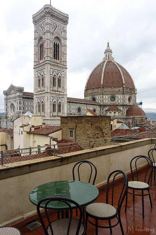 フィレンツェのドゥオーモ広場は建物周囲にあまりスペースがない。後から掲載していく写真を見ればわかるけど、至近距離から見上げるように見学する事になり、全体を見渡しにくかったりする。下側が隠れてしまっているけど、全景はこれくらいの距離から眺めるのが丁度良い気がした。値段と立地だけで選んだ割には悪くないホテルだった。