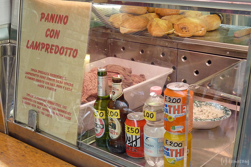 ランプレドットとはフィレンツェの伝統料理で、簡単に書くと牛もつを煮込んだもの。パニーノとはパンに具材を挟んだハンバーガーのようなサンドイッチのようなもの。