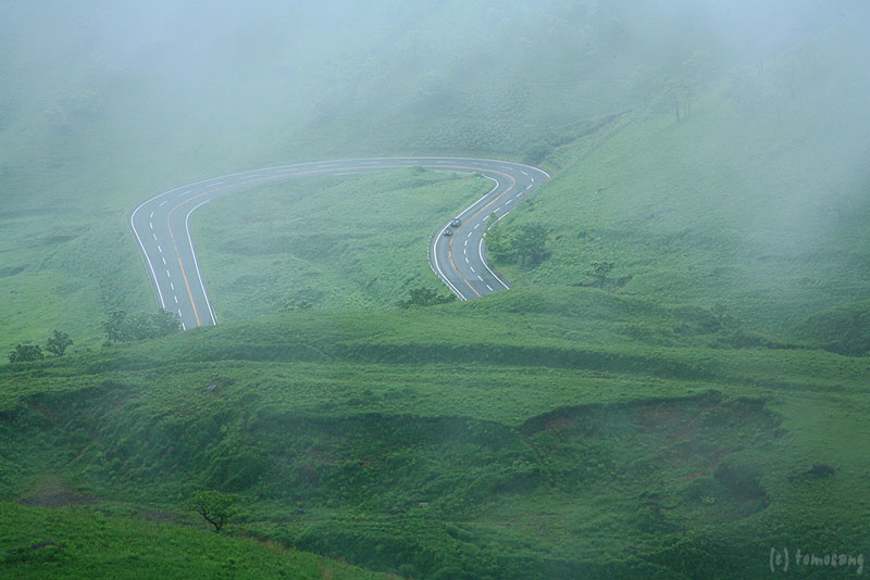 多くの人は「狭霧台」【湯布院の雲海】に車を止めて景観を楽しみますが、お勧めのパノラマスポットはさらに上へ登った所。道を上ると、右上に雨乞牧場へ入って行く細い道があります。入口に標識などはありませんが、その道の途中からの眺めがベストです。