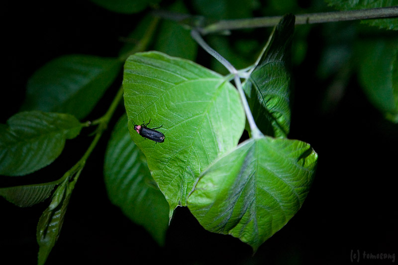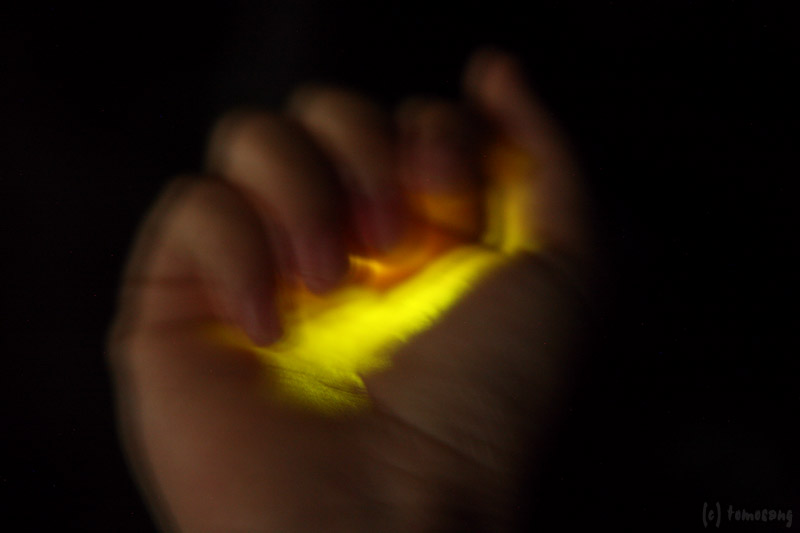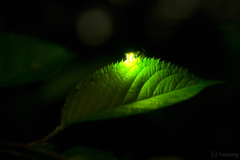 一匹のホタルが肩に止まって点滅しているのを、観賞に来ていたおばちゃん達に指摘される。ひっ捕らえてリリース!と思ったけど、その前に一枚撮ってみた。