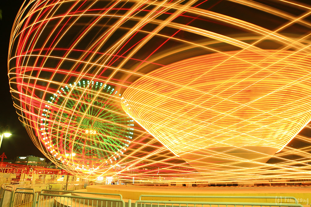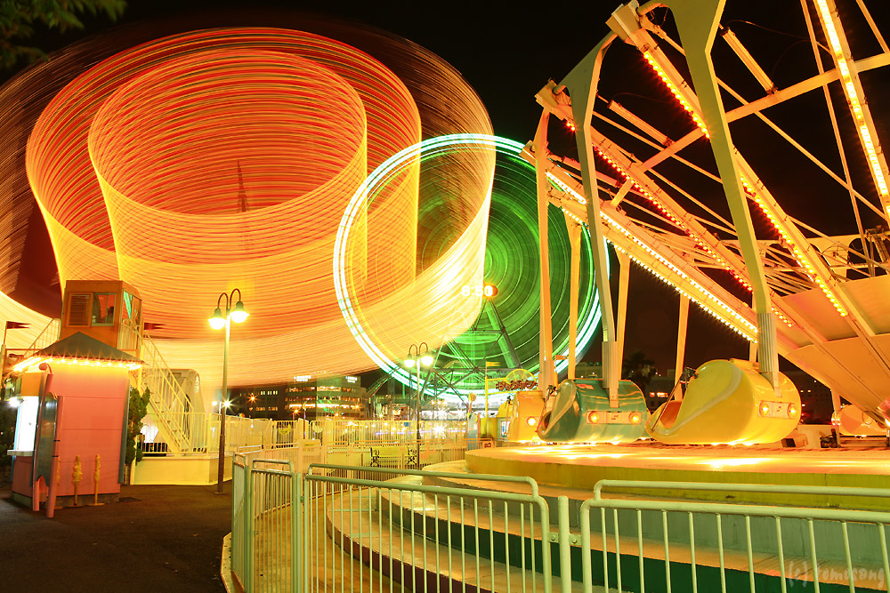 要は遊園地だ。各アトラクションにイルミネーションが付いていて雰囲気を盛り上げている。入場料とかはなく、各遊具施設の横まで行けるようになっている。前からやってみたかった長時間露光に挑戦してみる。