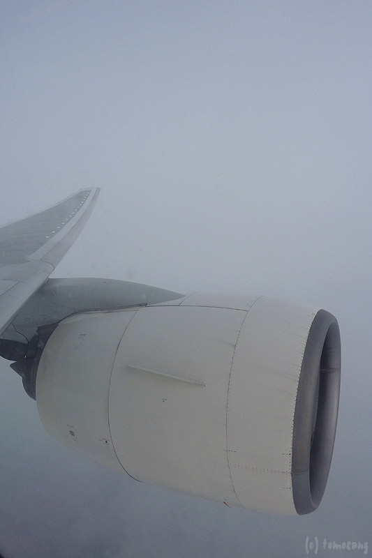 天気が悪かったので離陸後すぐに下界は真っ白。千円追加でクラスJへ変更してまで確保した富士山側の席だったのに・・・・
