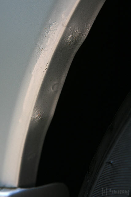 R32では定番箇所ですが、リアウィンドウモール部のサビ【ボディー腐食始まる。。。】に続き、ついにうちの個体もリアフェンダーに錆が発生し始めたようです。