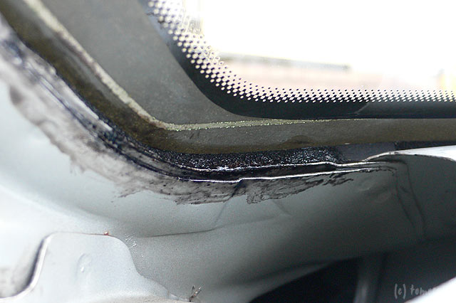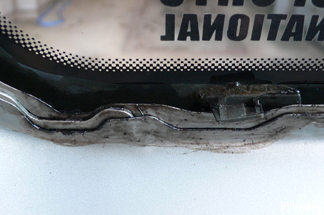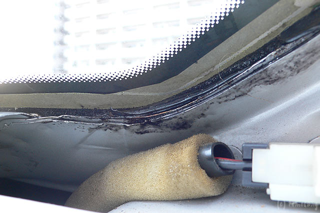 リアウインドーのシールが原因だと思うので、外側からモール部分にシリコンシーラントを塗っておいた。近い内にガラスを外すことを考え、薄塗り。