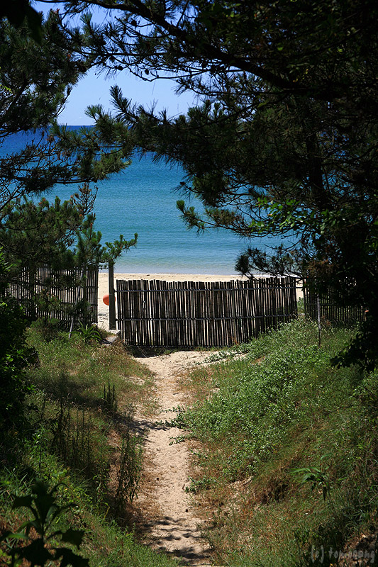 お宮の裏に道が繋がっていて、鳥居を抜けて階段を下ると砂浜に出る。