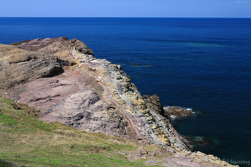 岩の黄色い部分がもろくて洞窟になりやすいらしい。そして岸壁に大波が打ち寄せると、海水が岸壁の上から噴水の様に吹き出す現象が見られるということだ。